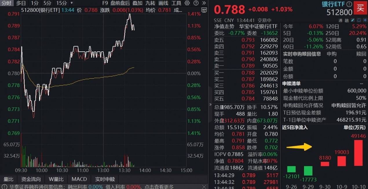 值得一提的是,近日银行板块已吸引资金密集涌入,上交所数据显示,银行ETF(512800)连续3日吸金,合计获净流入7.63亿元。